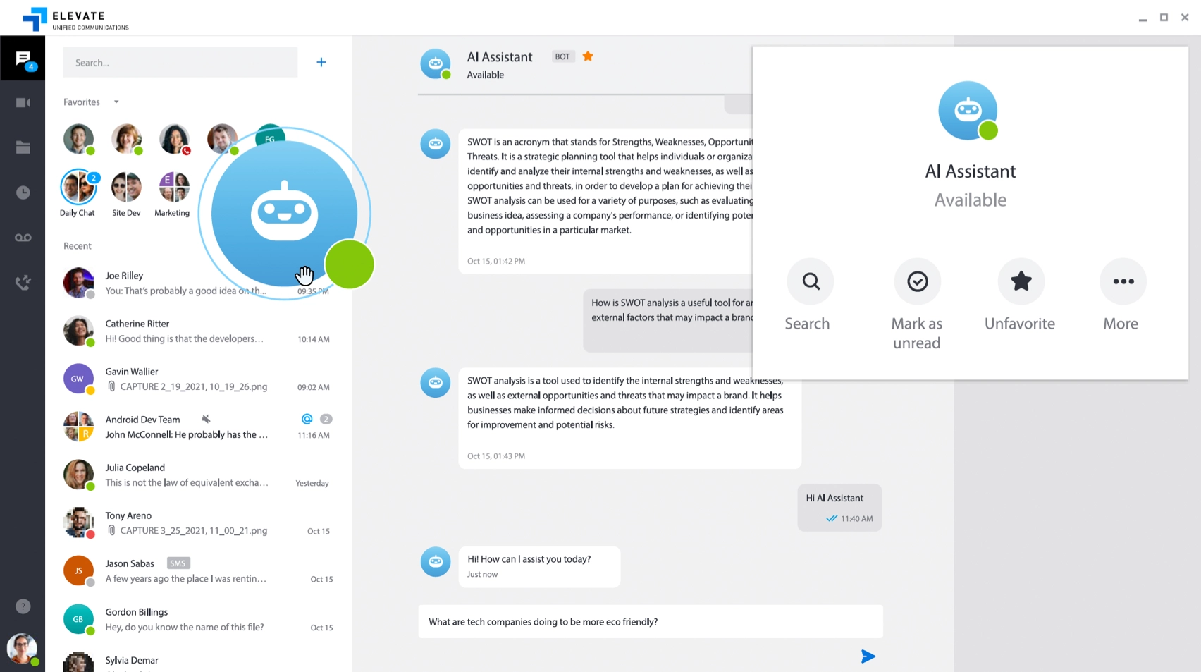Elevate AI Assistant is a business productivity tool using Generative AI to help employees access information more easily and help with repetitive or time-consuming tasks. And, it’s built into the Elevate desktop and mobile application where all business communications and collaboration happens.